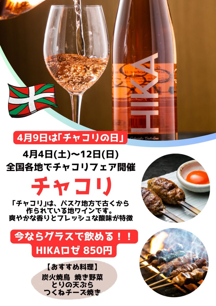 4月9日は「チャコリの日」ということで、4日〜12日までチャコリウィーク。全国各地でチャコリ関連のイベントが開催されますよ。当店でも、期間中、チャコリHIKAロゼをグラスで提供しております。焼鳥にもぴったりですので、この機会にぜひ😋